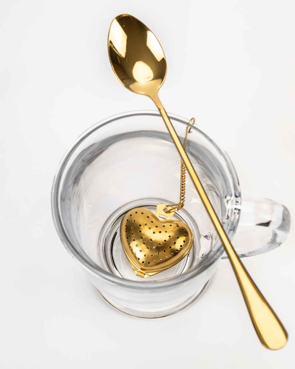 Den matchende tekoppen graveres med navn, noe som skaper en eksklusiv og personlig følelse ved hver tekopp. Settet inkluderer også en gullfarget skje og et hjerteformet tesil som gir en sjarmerende og stilfull touch.