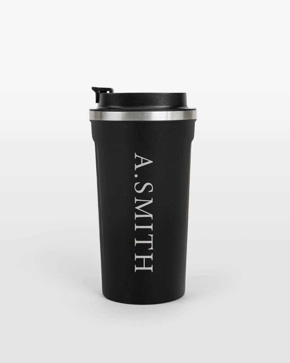 Denne stilrene travelmuggen med matt svart finish graveres med valgfritt navn, noe som gjør den til en unik og personlig del av hverdagen. En perfekt gave til noen som alltid er på farten – enten det er til jobb eller en utflukt.
