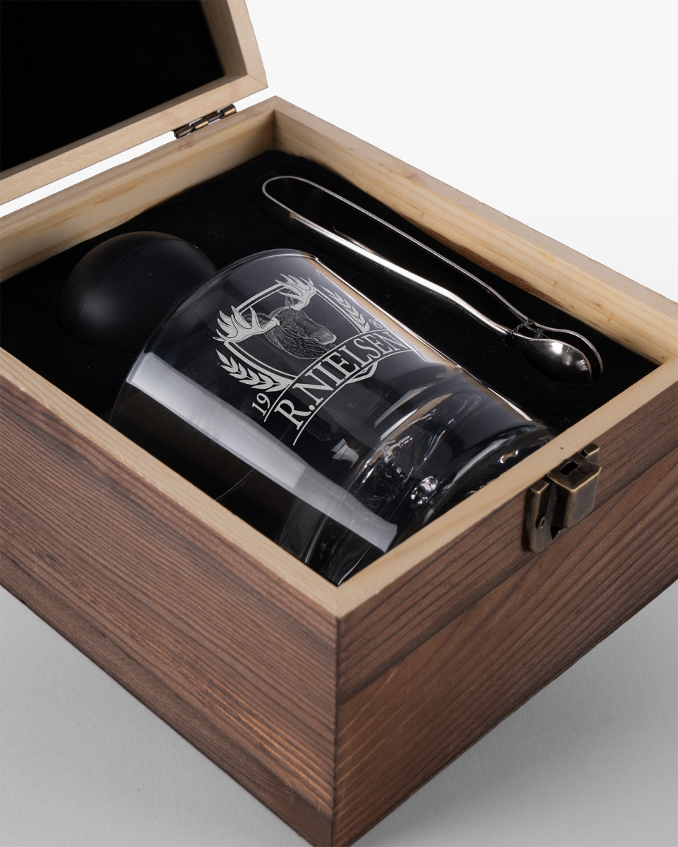 Settet inneholder et stilfullt whiskyglass som graveres med valgfritt navn og i tillegg et jaktinspirert motiv: velg mellom tiur, bjørn, villsvin, dåhjort, elg eller fisk – symboler som gjenspeiler lidenskapen for natur og villmark. I bunnen av glasset finnes dessuten et vakkert fjellmotiv som løfter opplevelsen ved hver eneste slurk.