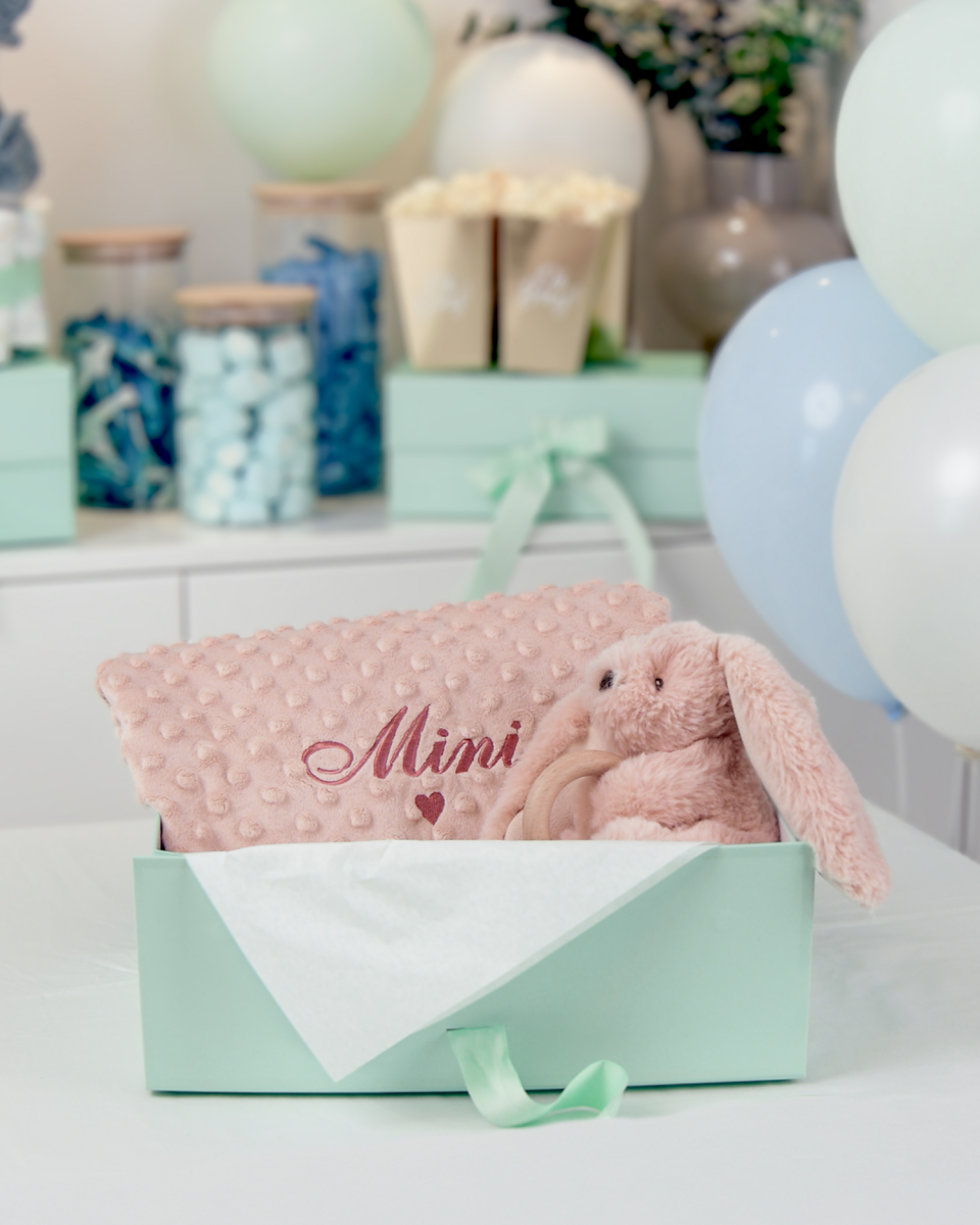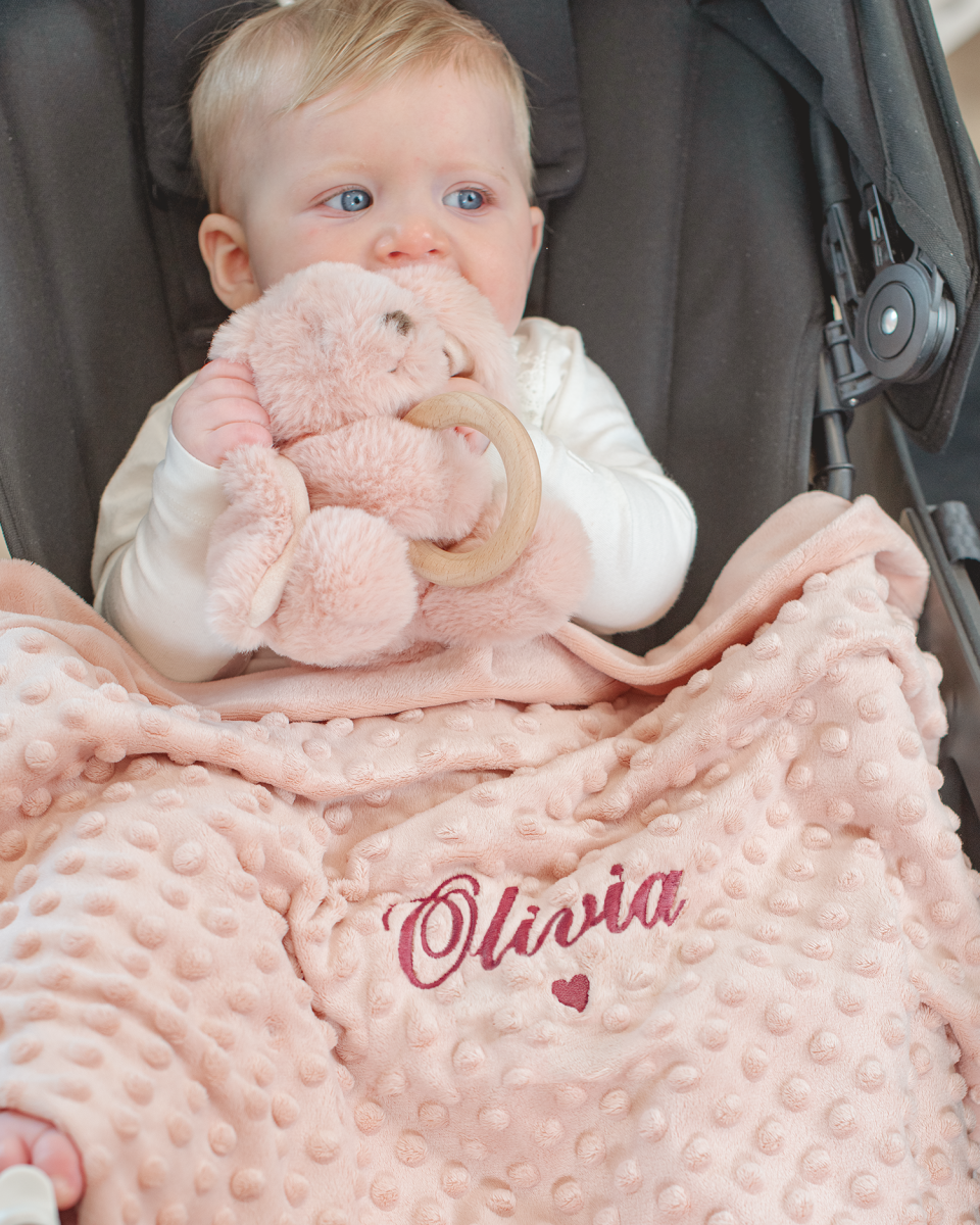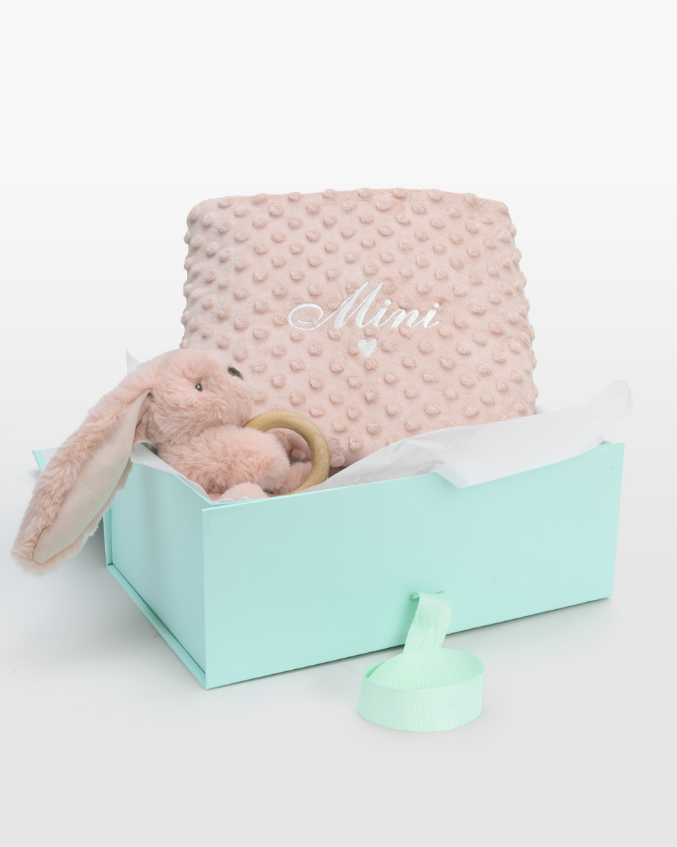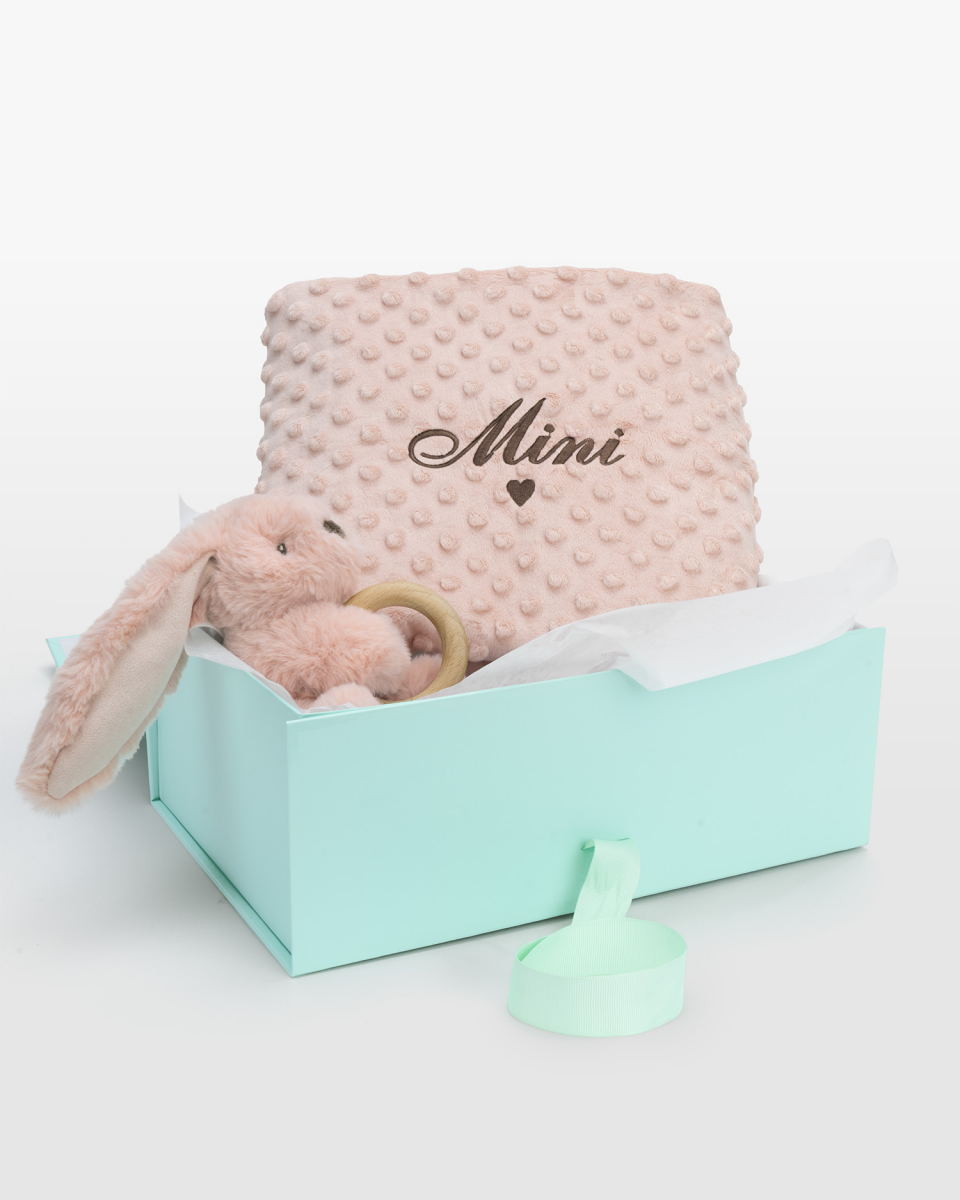 Kosedyr med biteleke i tre & Babyteppe med navn, rosa - Babyshower