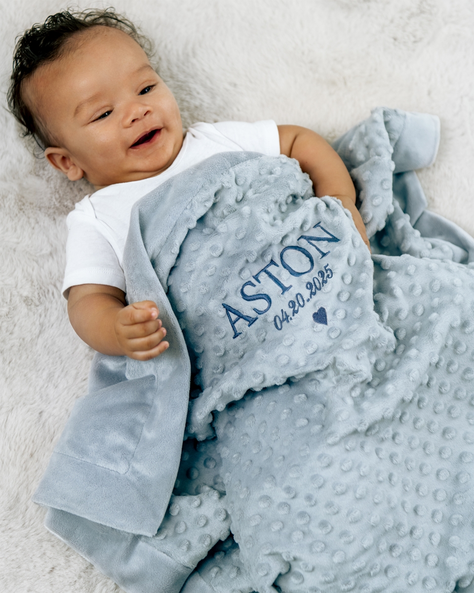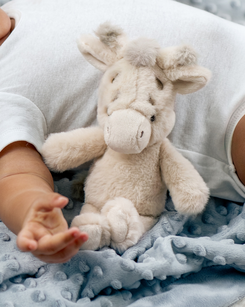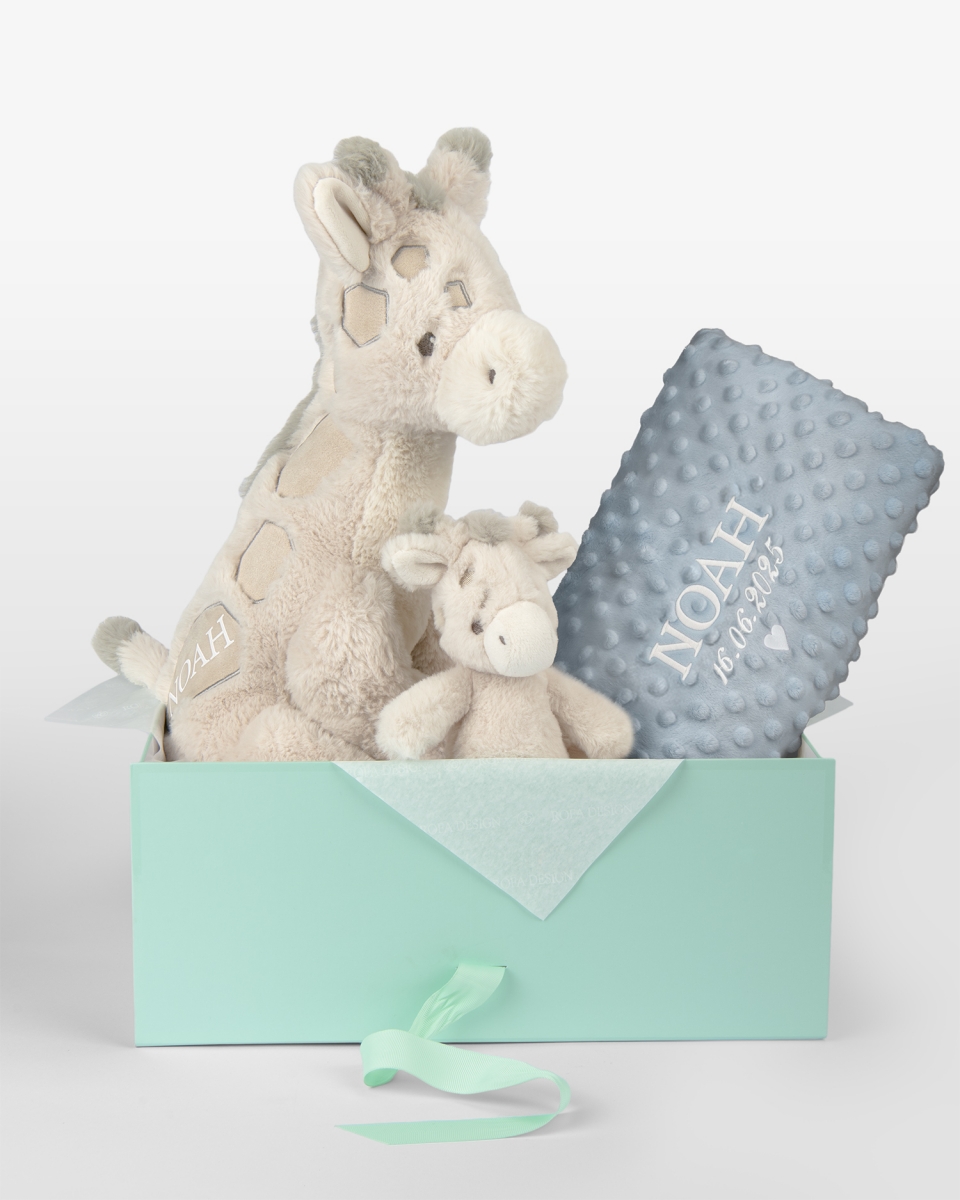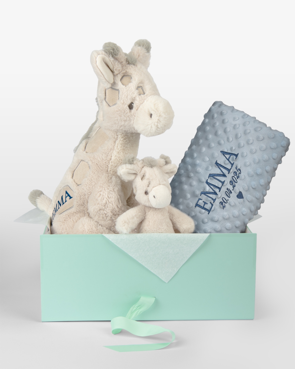 Kosedyr, kosedyr med rangle og Babyteppe med navn, blå – Sjiraff