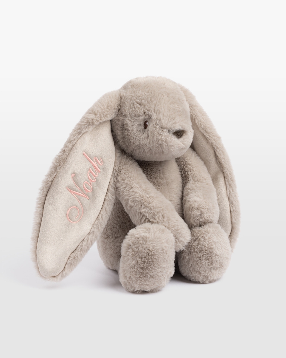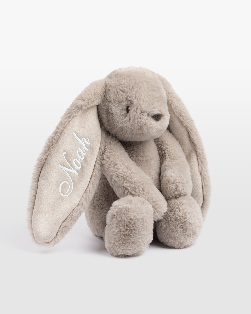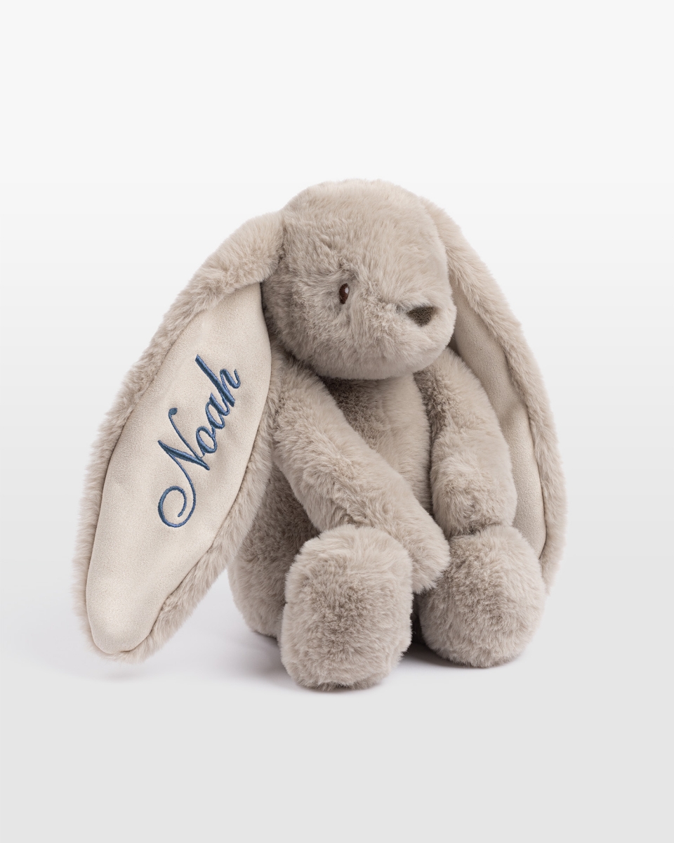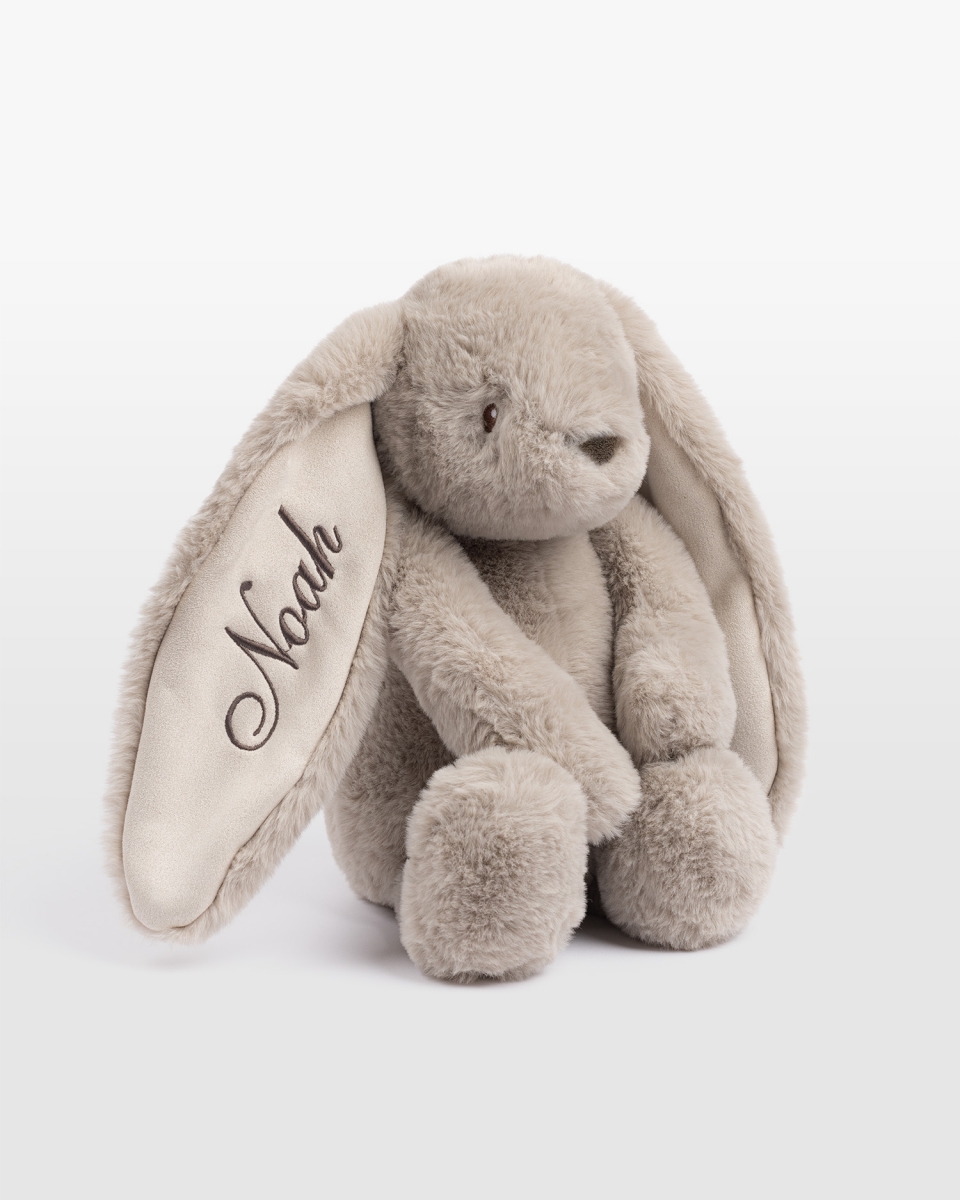 På kaninens øre broderer vi barnets navn, noe som gjør at kosedyret blir en enda mer minneverdig og spesiell del av barndommen.