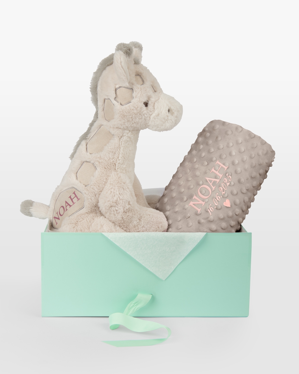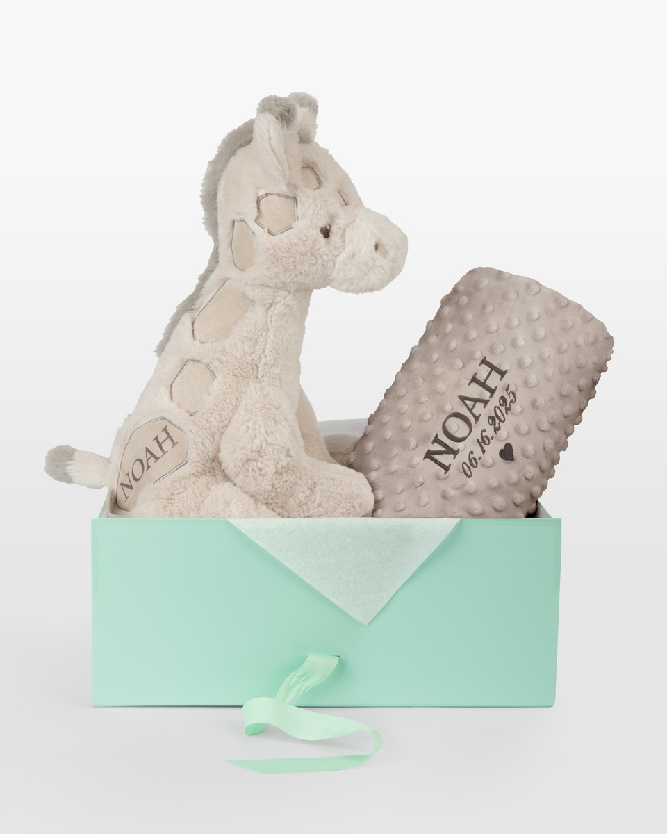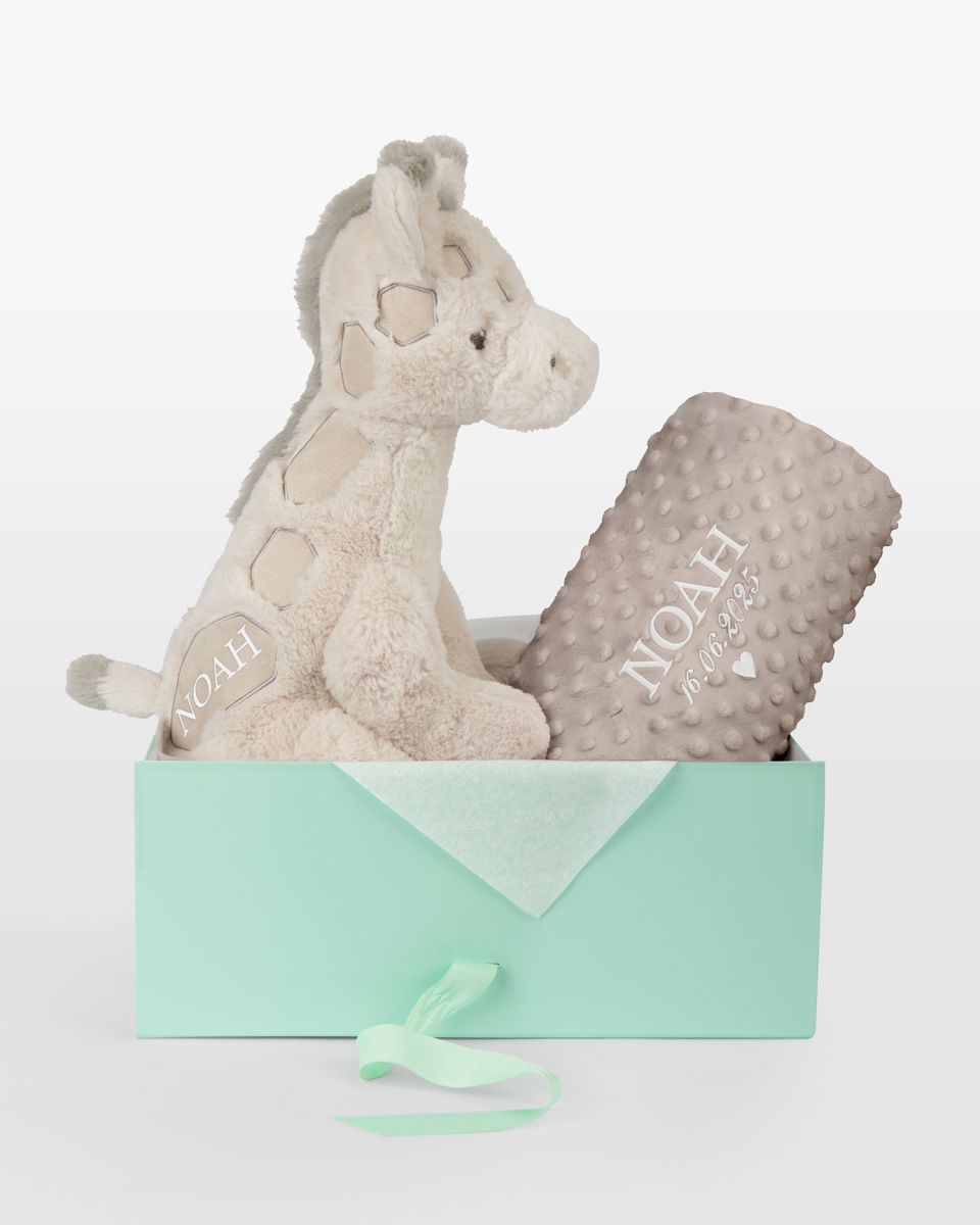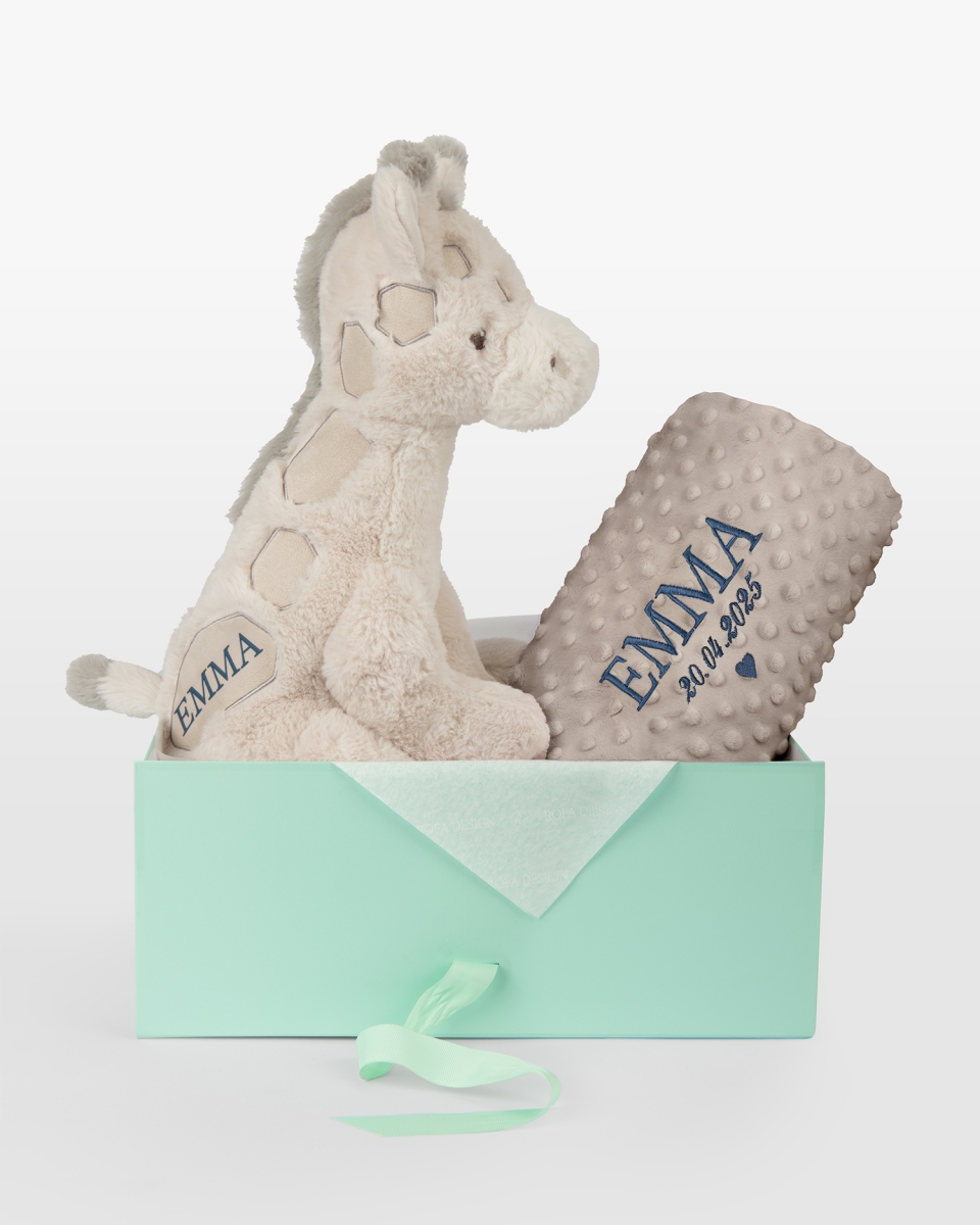 Et harmonisk og personlig gavesett der hver detalj er valgt for å skape trygghet og minner fra livets aller første tid. Settet består av et mykt kosedyr formet som en vennlig giraff med barnets navn, samt et stilrent sandfarget babyteppe brodert med barnets navn og fødselsdato – en tidløs kombinasjon som passer for alle små. Et personlig minne skapt for å følge barnet gjennom barndommens alle øyeblikk. Broderiet kan utføres i brunt, blått, rosa eller hvitt for å gi gaven et helt eget uttrykk.