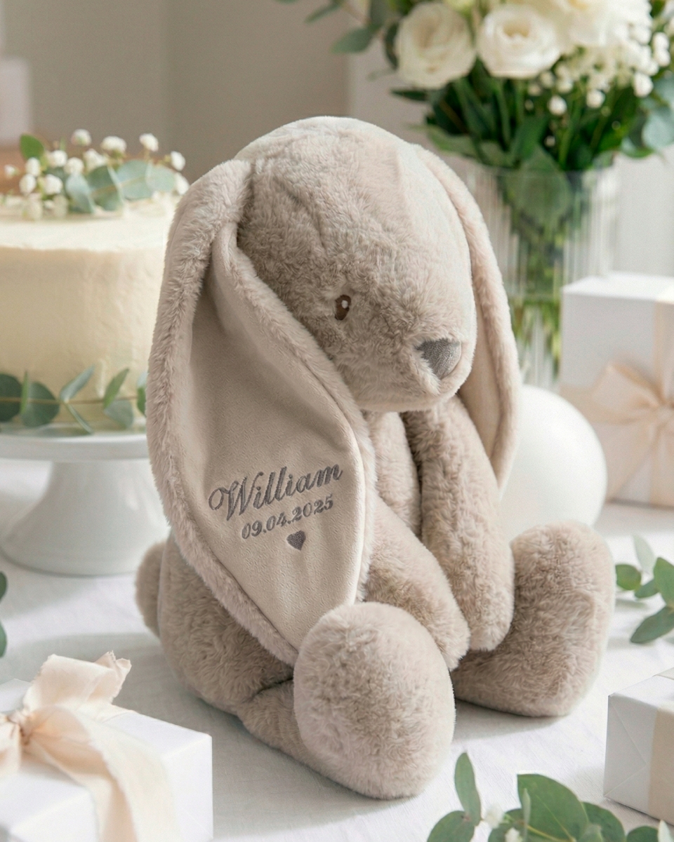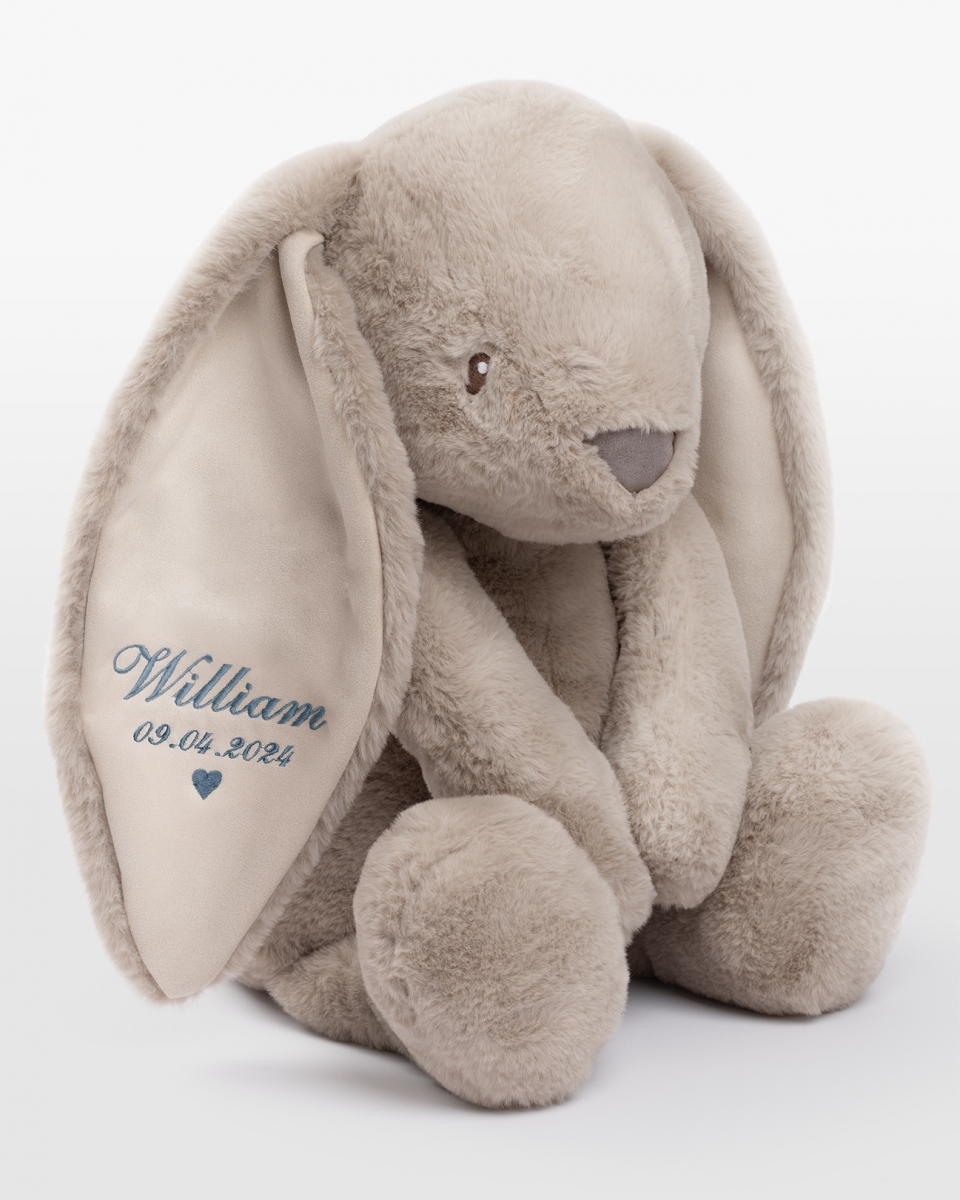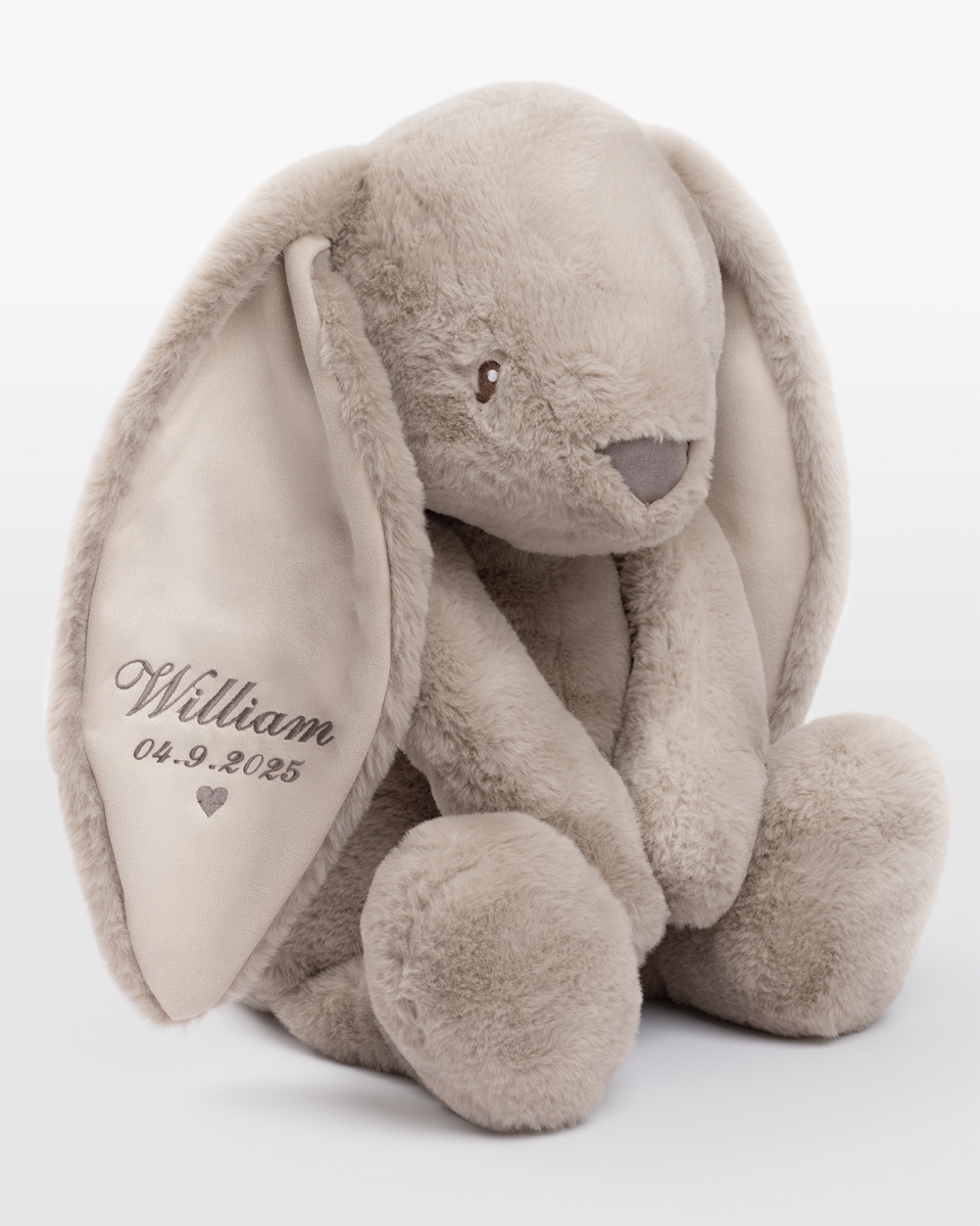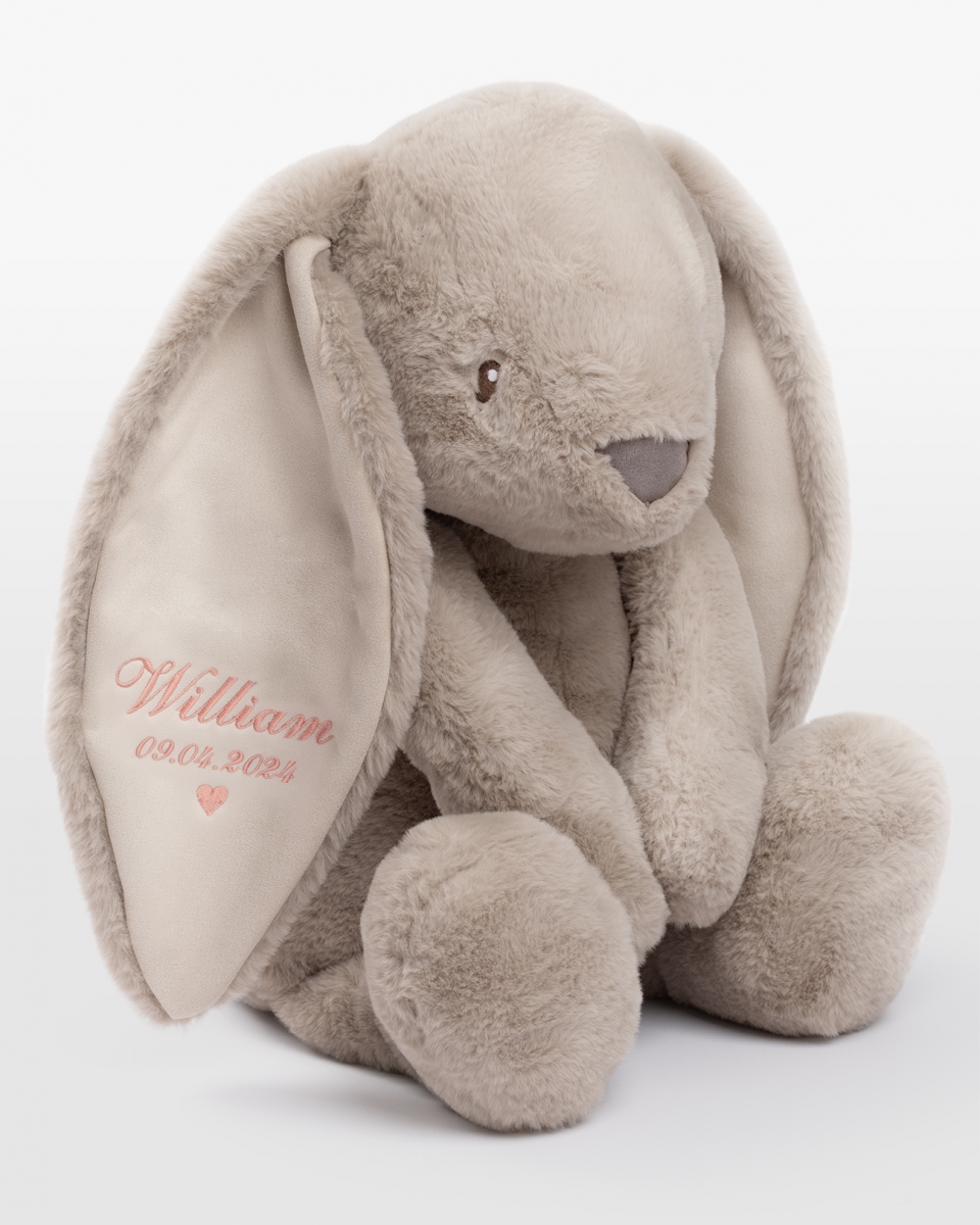Et stort kosedyr for ekstra varme og store klemmer. Kosedyrkaninen som broderes med barnets navn i øret, blir en spesiell og unik venn å skape varme minner med.