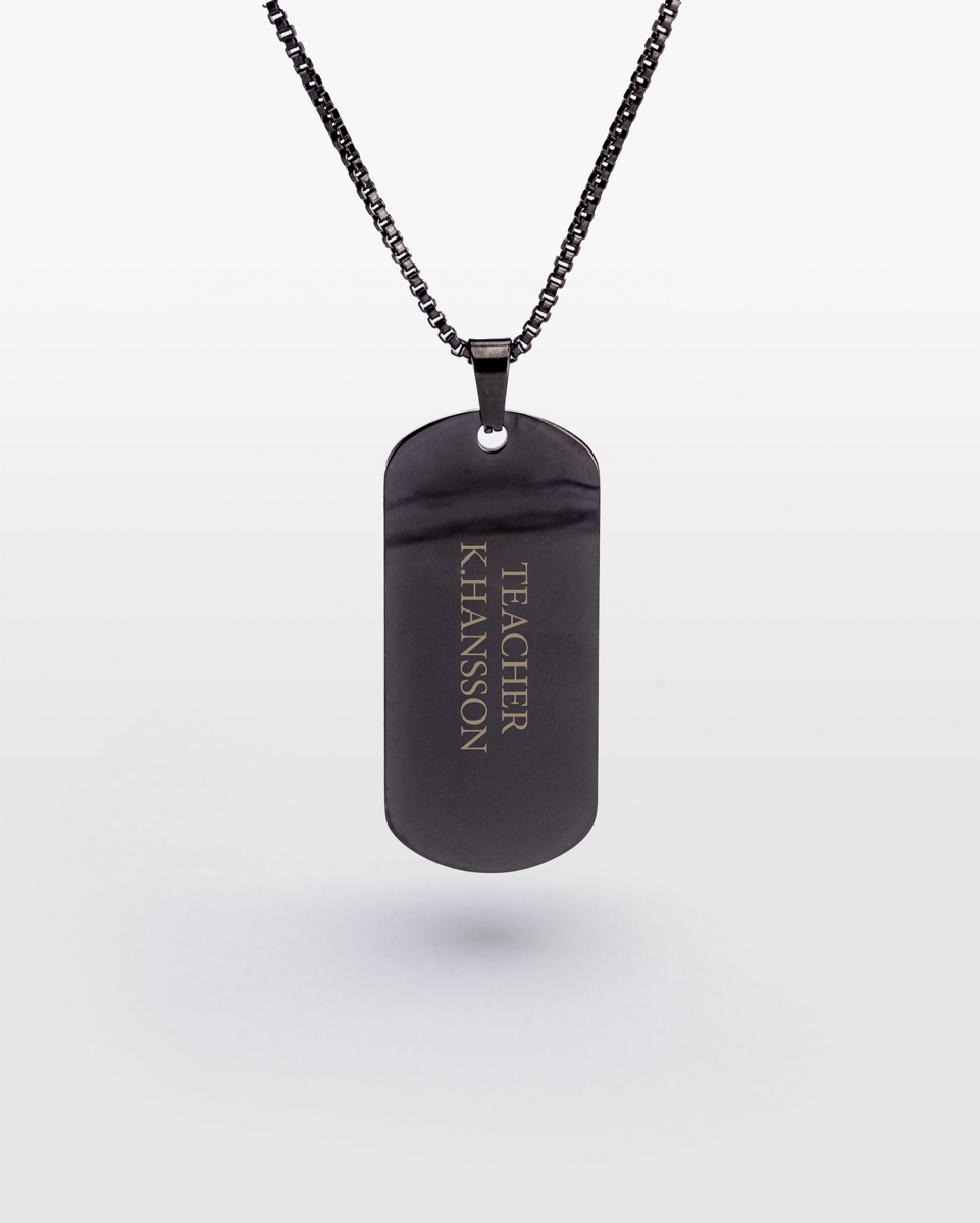 Dette stilrene halskjedet har en svart stålbrikke som graveres med din egen tekst, noe som gjør det til et personlig og meningsfullt tilbehør for ham. Det svarte smykket har et tidløst design som vil bli elsket i lang tid, perfekt både til fest og hverdag.