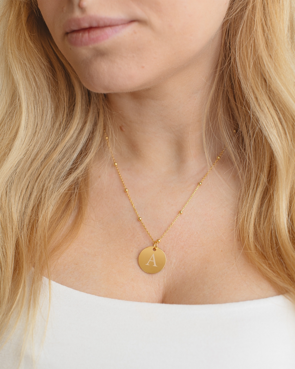 Dette navnesmykket er et vakkert og personlig tilbehør til henne. Den tynne, dekorative gullkjeden bærer et fint smykke i form av en sirkel, som graveres med din personlige tekst, for eksempel navn eller initialer. En tidløs design som gjør det til en unik gave med personlig gravering.