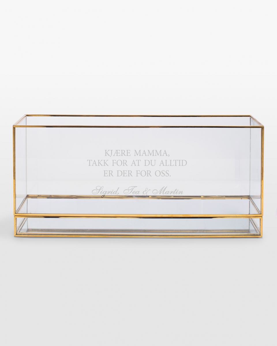 Den flotte lysboksen i gull graveres med din ønskede personlige gravering. Hvorfor ikke skrive en fin hilsen til noen nær deg, eller skjem bort deg selv og din familie med en personlig interiørdetalj? Denne vakre lysboksen med navn er perfekt å gi bort som bryllupsgave, til søsken, som innflyttingsgave eller som en rørende, personlig gave til din kjære partner.