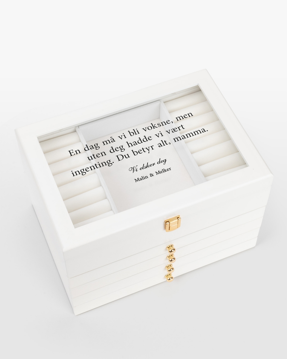 For å gjøre smykkeskrinet ekstra personlig, trykkes det med navn og valgfri tekst – kanskje et inspirerende sitat, en vakker hilsen eller et spesialbudskap.