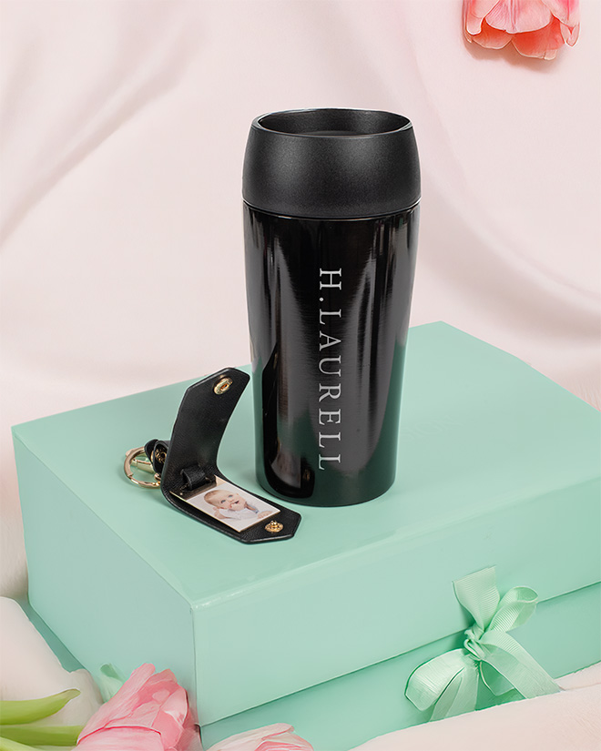 Overrask noen spesiell med dette stilige gavesettet som kombinerer eleganse med funksjonalitet. Settet inneholder en praktisk termokopp og en personlig nøkkelring.