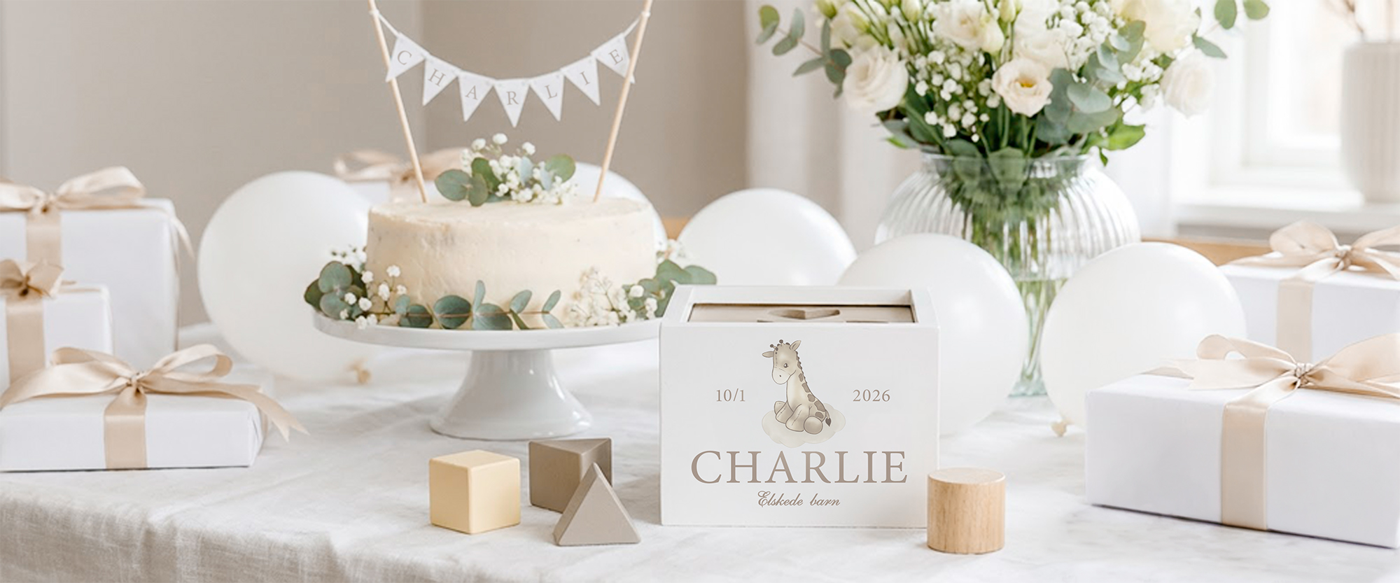 Oppdag våre personlige navngivningsgaver, velg mellom forskjellige motiver og budskap plassert på både barnemøbler, dekorasjoner og leker.