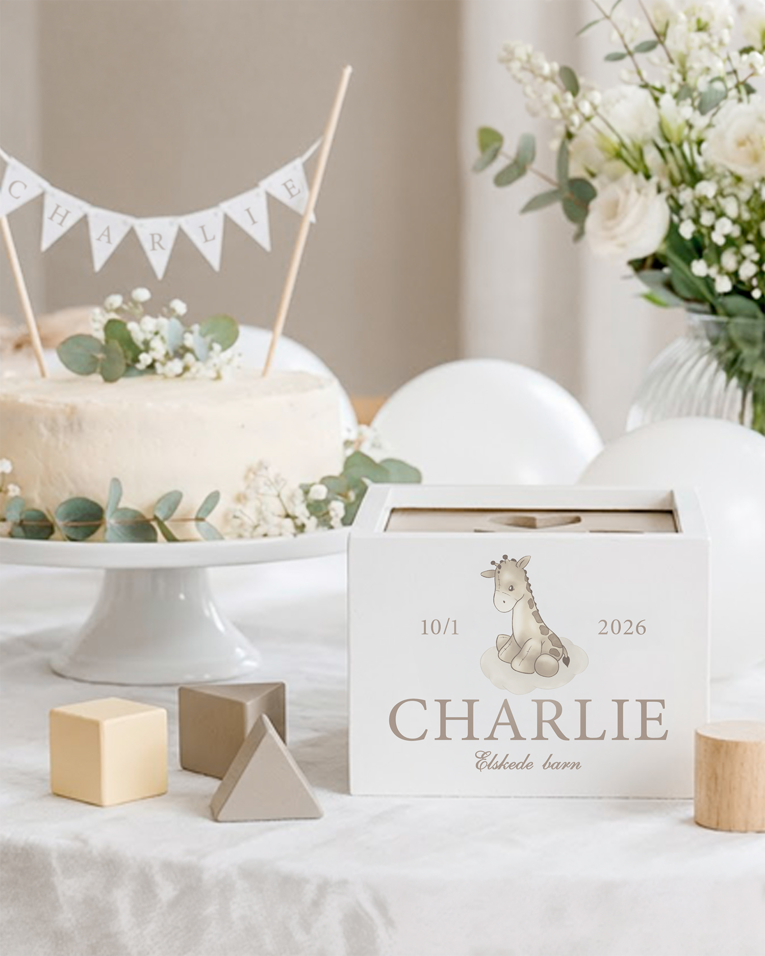 Dåpskiste med navn, hvit - Sjiraff