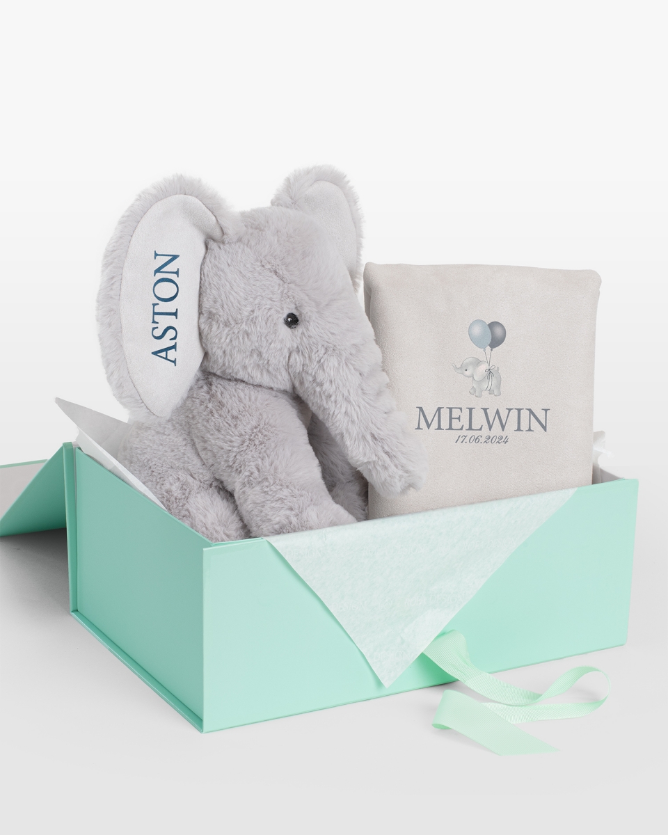 Gi den lille en unik og personlig gave med dette herlige gavepakken, som inneholder både et koselig kosedyr i form av Elefant Fante og et fint putevar med navn.