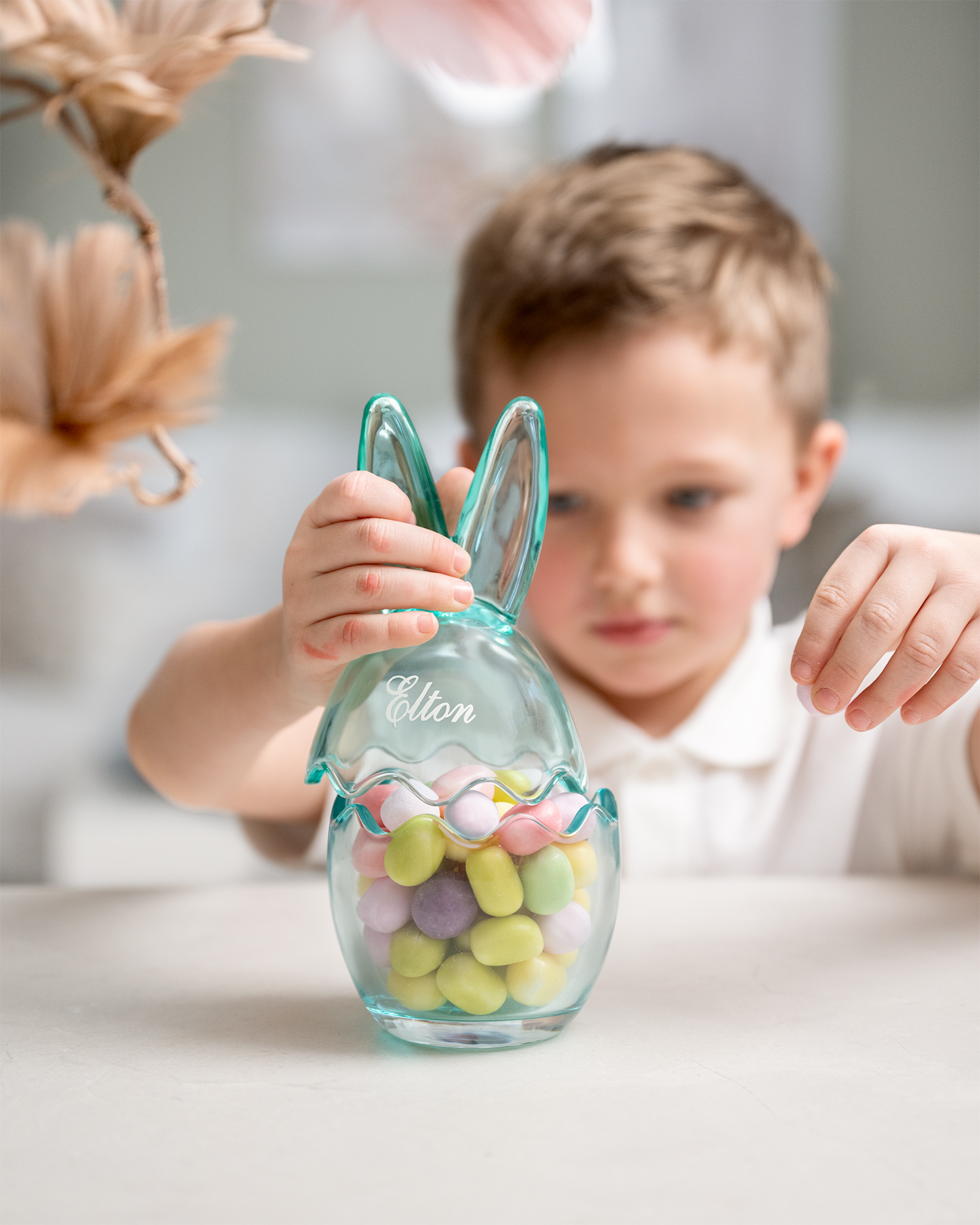 Våre vakre påskeegg i glass kommer i flere forskjellige farger: mørkeblå, rosa, mint og lilla. På forsiden av påskeegget graveres barnets navn og, om ønskelig, et vakkert budskap eller en hilsen. Et elegant og tidløst alternativ som kan gjenbrukes år etter år og tas vare på som et fint minne. Disse påskeeggene kan fylles med både godteri og sunne snacks. Hvorfor ikke pakke påskeegget inn i cellofan med et fint bånd, så er gaven klar til å overrekkes til den heldige mottakeren?