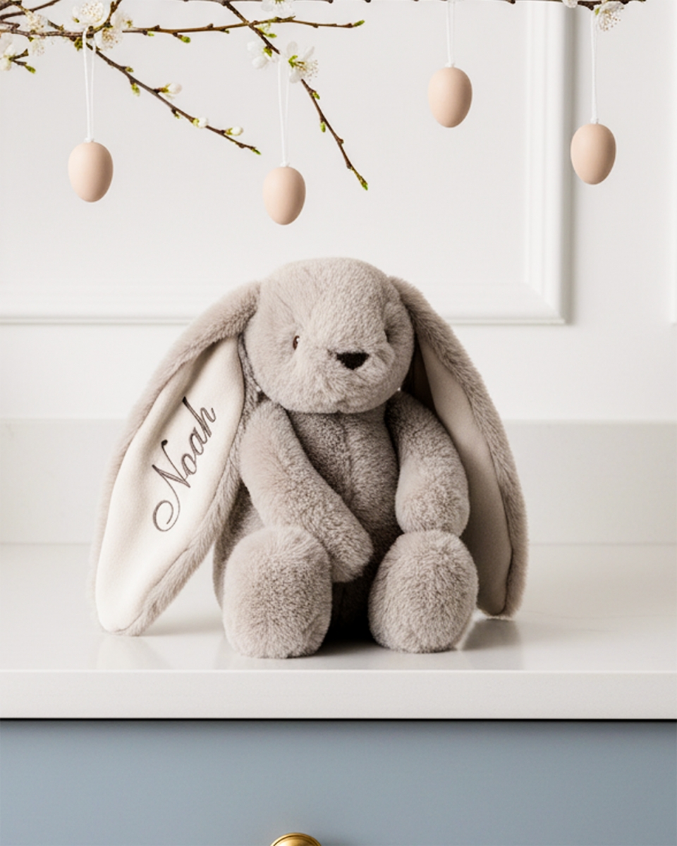 På kaninens øre broderer vi barnets navn, noe som gjør at kosedyret blir en enda mer minneverdig og spesiell del av barndommen.