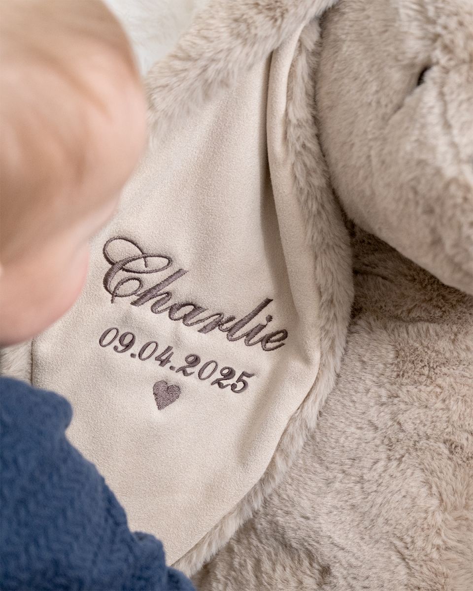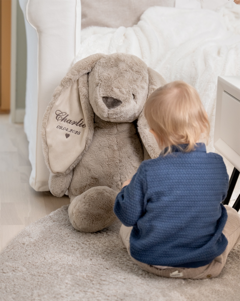 Et stort kosedyr for ekstra varme og store klemmer. Kosedyrkaninen som broderes med barnets navn i øret, blir en spesiell og unik venn å skape varme minner med.