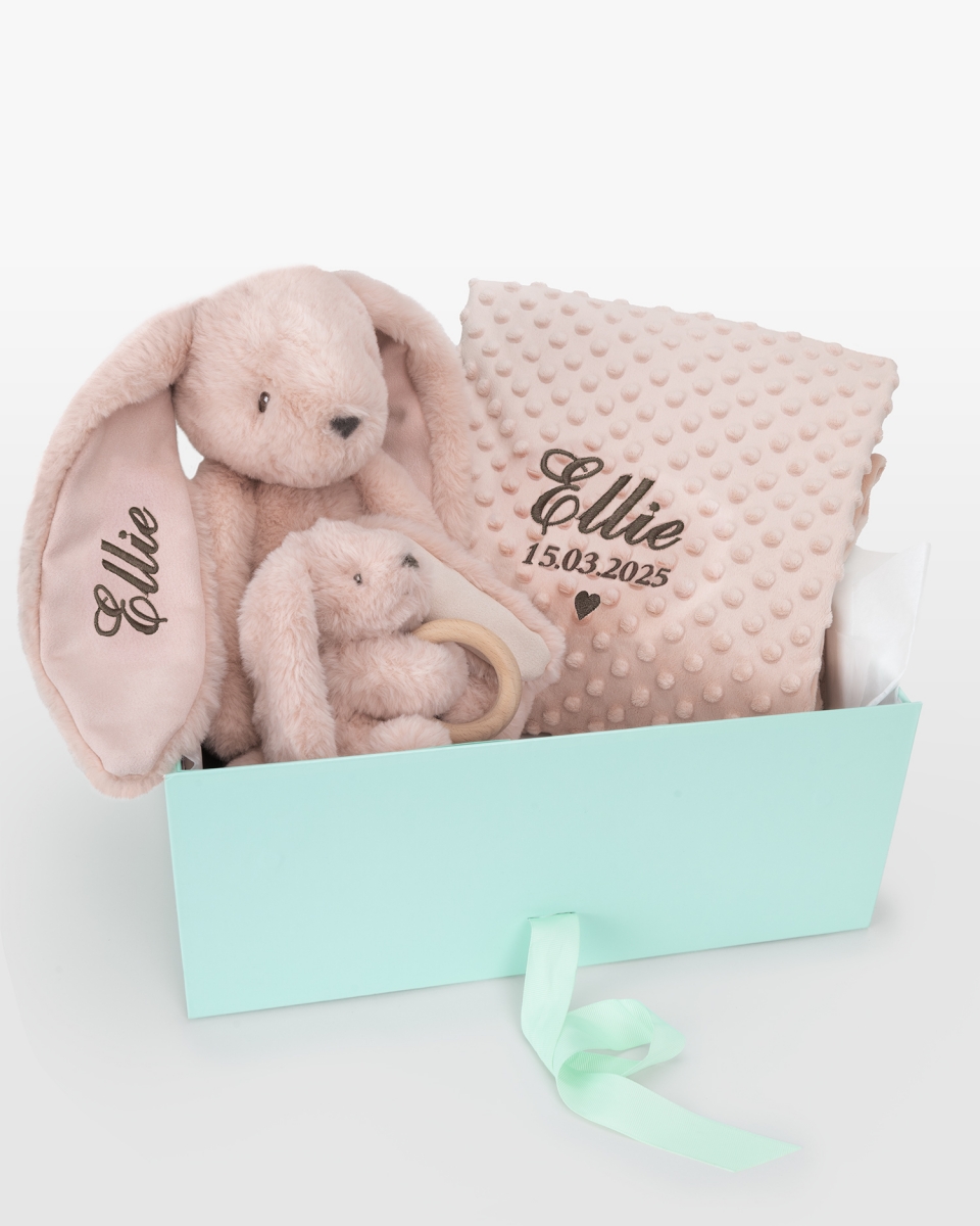Kosedyr, musselinteppe & tøfler i gavesett, rosa