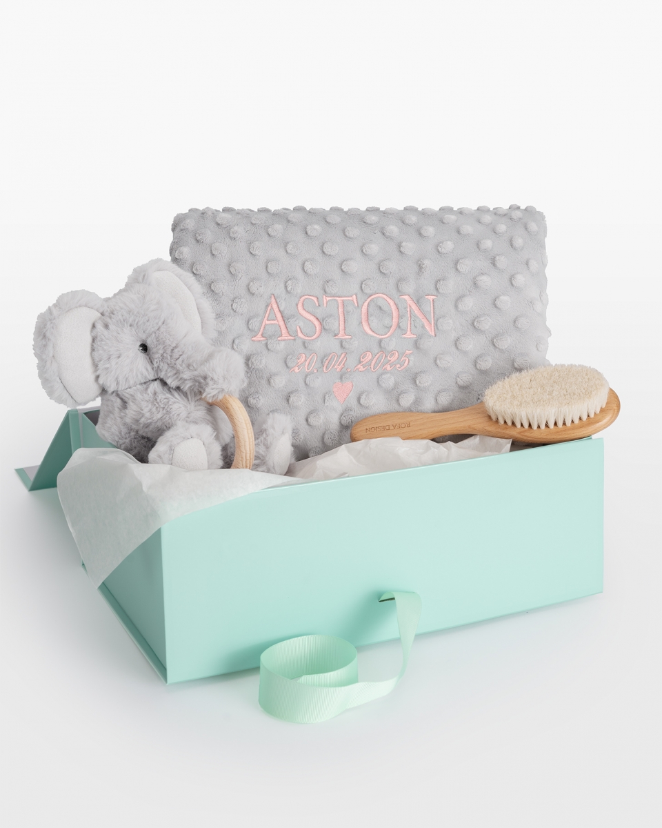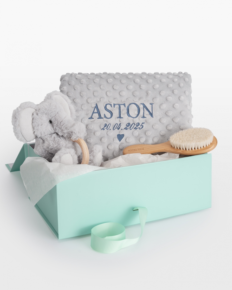 Kosedyr med bitering, hårbørste & babyteppe med navn, Grå – Elefant