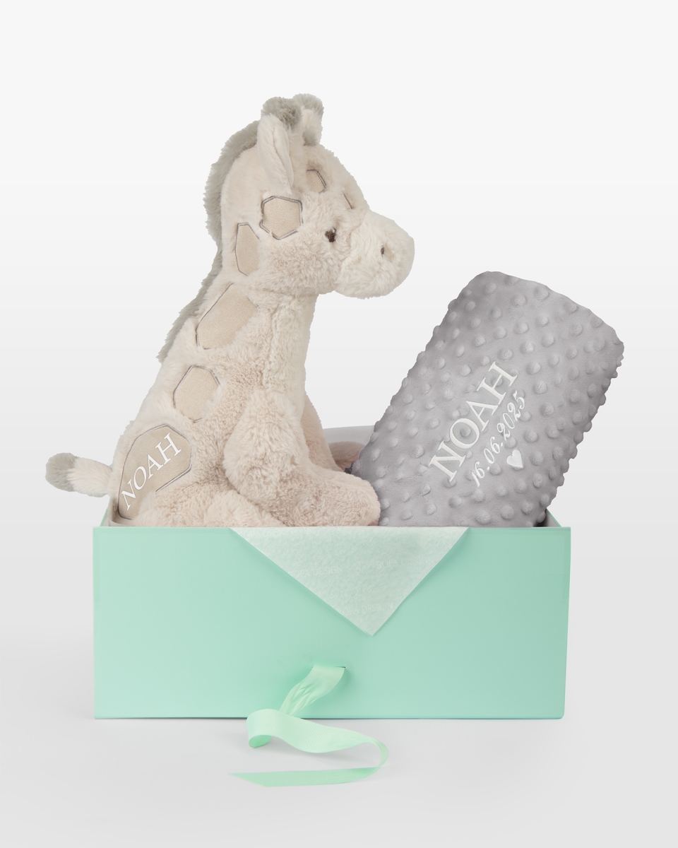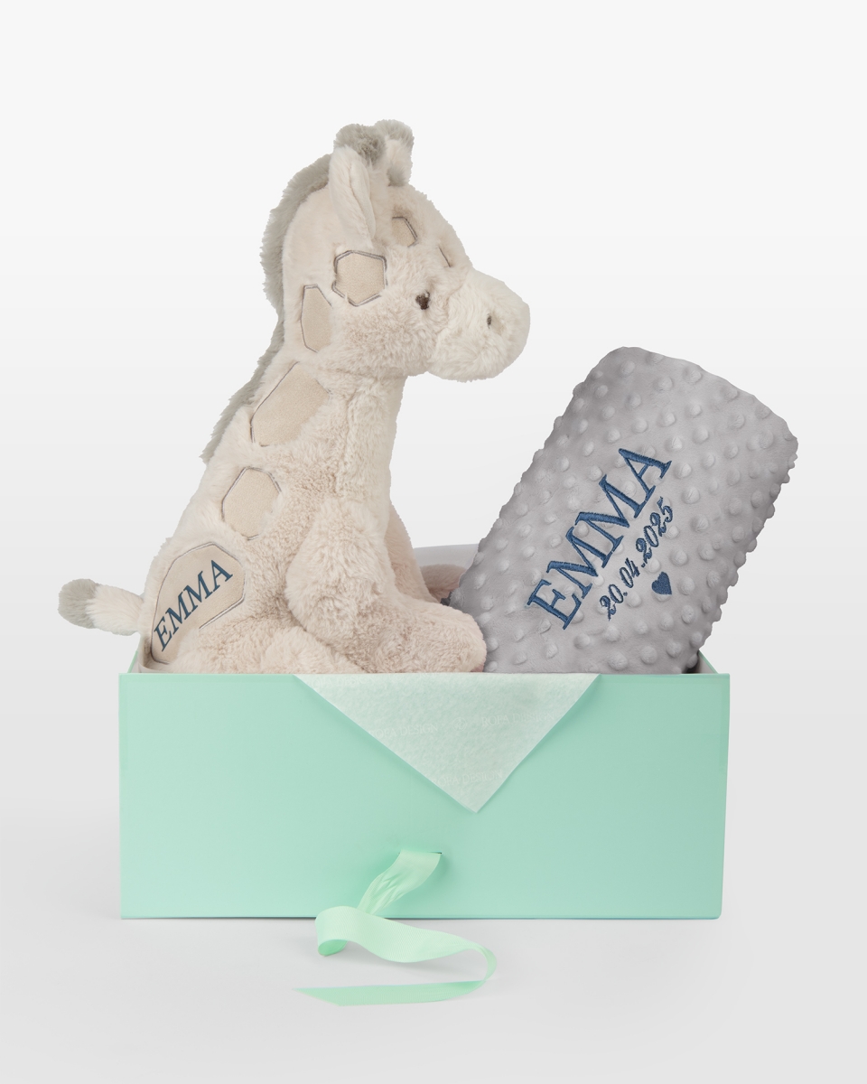 Et gavesett der hver detalj er valgt med omtanke for livets aller første øyeblikk. Settet inneholder et koselig kosedyr formet som en vennlig giraff med barnets navn samt et elegant grått babyteppe med barnets navn og fødselsdato – et tidløst minne skapt for å følge barnet gjennom oppveksten. Broderiet kan utføres i blått, brunt eller hvitt, noe som gir mulighet til å sette et helt personlig preg på gaven.
