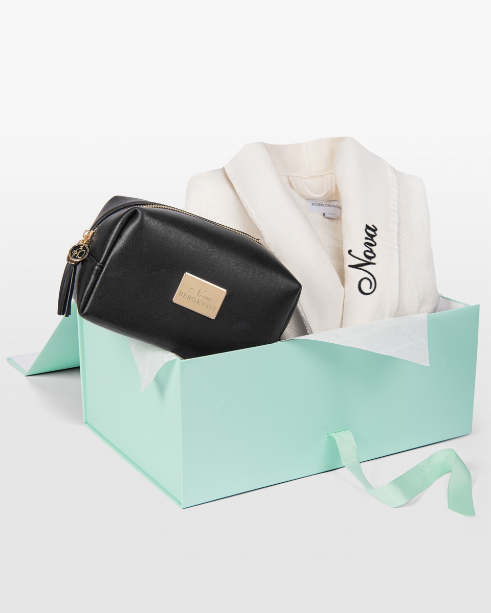 Gjør barnets morgener og badestunder ekstra koselige med dette sjarmerende gavesettet som inneholder en myk barnbadekåpe og en stilren necessær med navn.