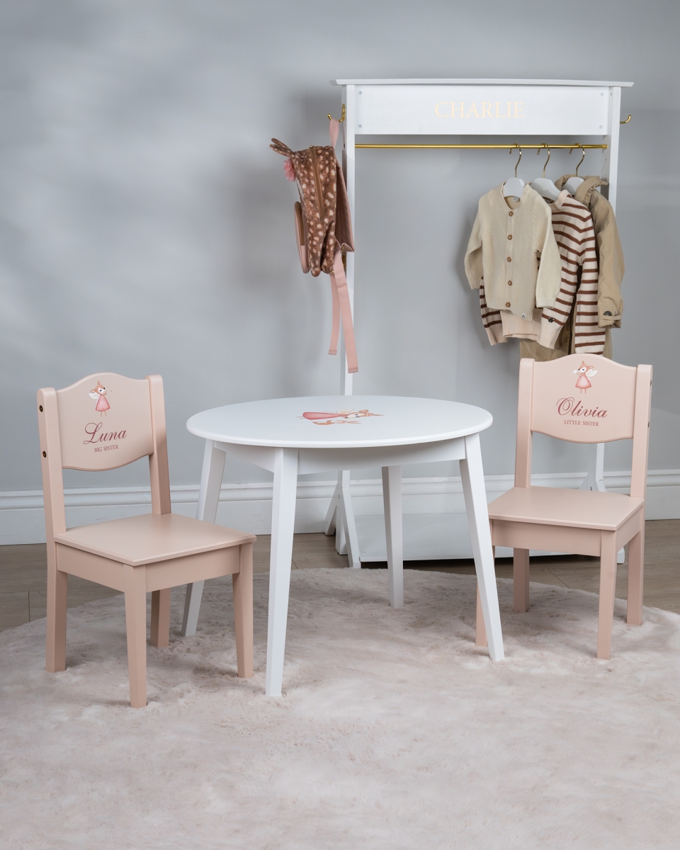 Gi plass til fantasien med dette sjarmerende barnemøbelsettet – et personlig og koselig hjørne hvor lek, kreativitet og drømmer får utfolde seg. Settet består av et solid bord og to matchende stoler, vakkert dekorert med et hjertevarmt motiv av rådyret Rut – en liten venn med et stort hjerte.