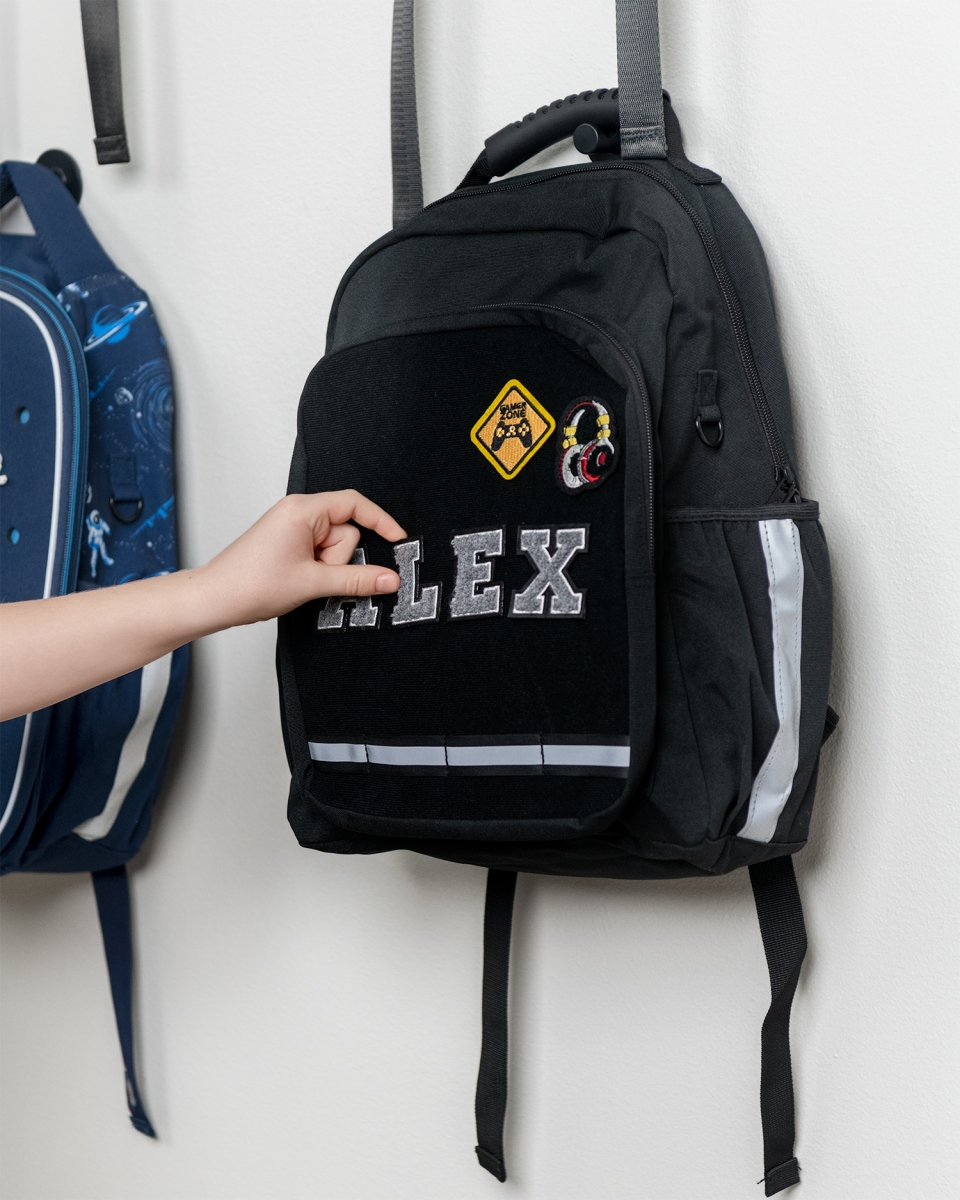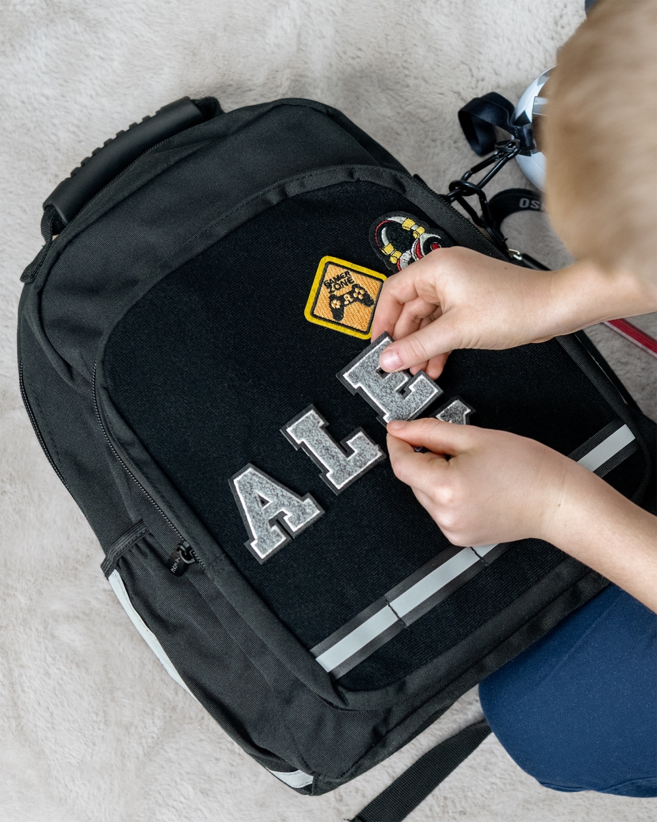 Med den svarte barneryggsekken følger to typer stoffmerker, et par kule hodetelefoner og et merke med en spillkontroll. Stoffmerkene har borrelåsbakside, noe som gjør dem lette å feste på ryggsekken - en morsom detalj for barnet. Selvfølgelig kan du også kjøpe flere merker hvis du vil legge til andre morsomme figurer, eller kjøpe bokstaver