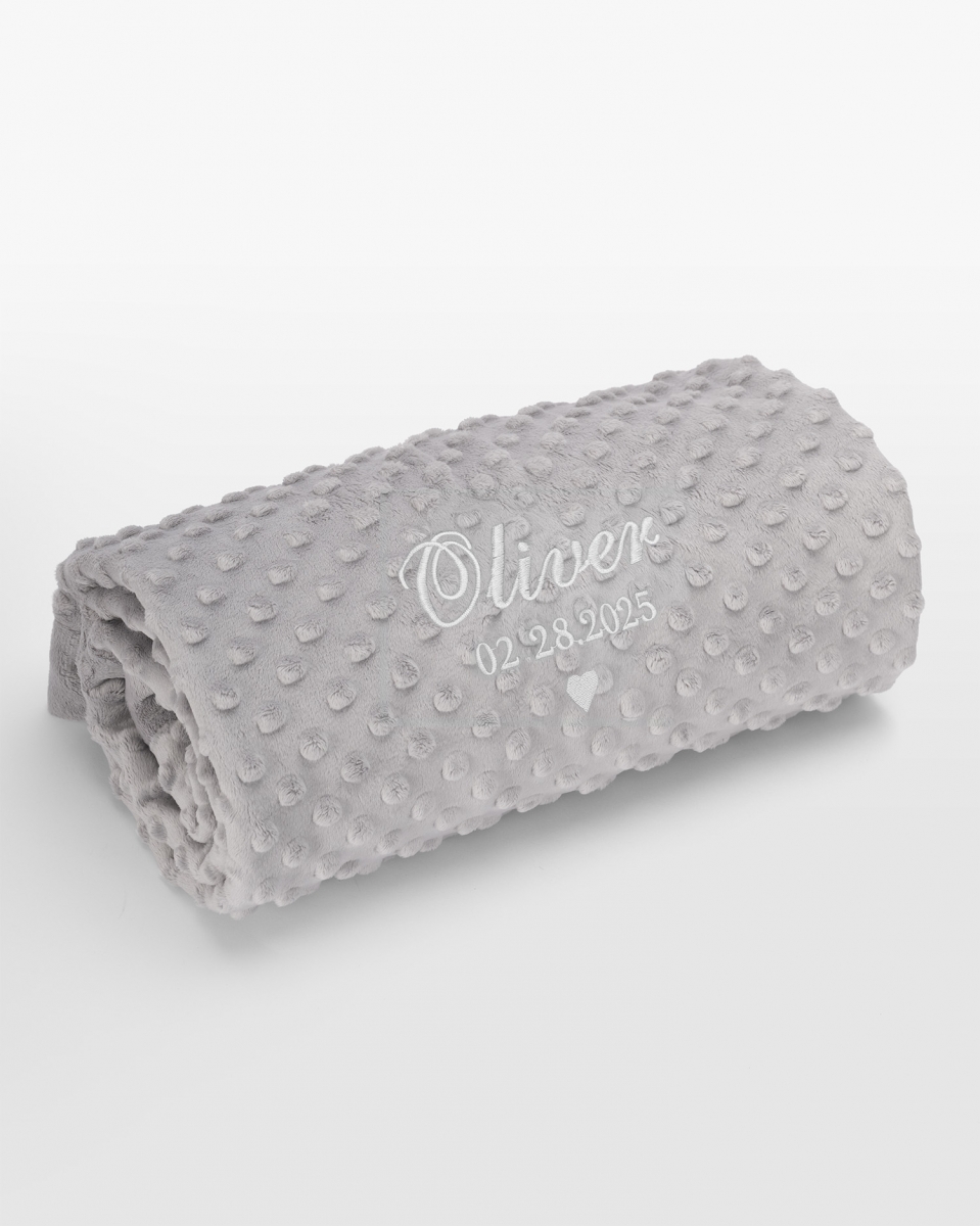 Et mykt og klassisk babyteppe i grått, brodert med barnets navn og fødselsdato. Dette teppet er omhyggelig designet for å gi barnet både varme og trygghet, uansett om det brukes i sprinkelsengen, vognen eller til koselige stunder i armene. Det myke materialet er skånsomt mot barnets sensitive hud og blir raskt en favoritt å kose med.