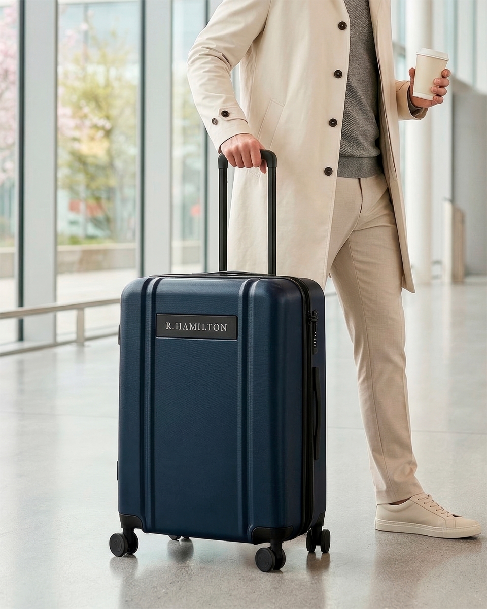 Denne kofferten med navn kombinerer både stil og funksjon, med sine forseggjorte detaljer og den fine strukturen. Det som gjør denne kofferten unik er den personlige graveringen, som sammen med den svarte metallplaten virkelig får kofferten din til å skille seg ut fra mengden.