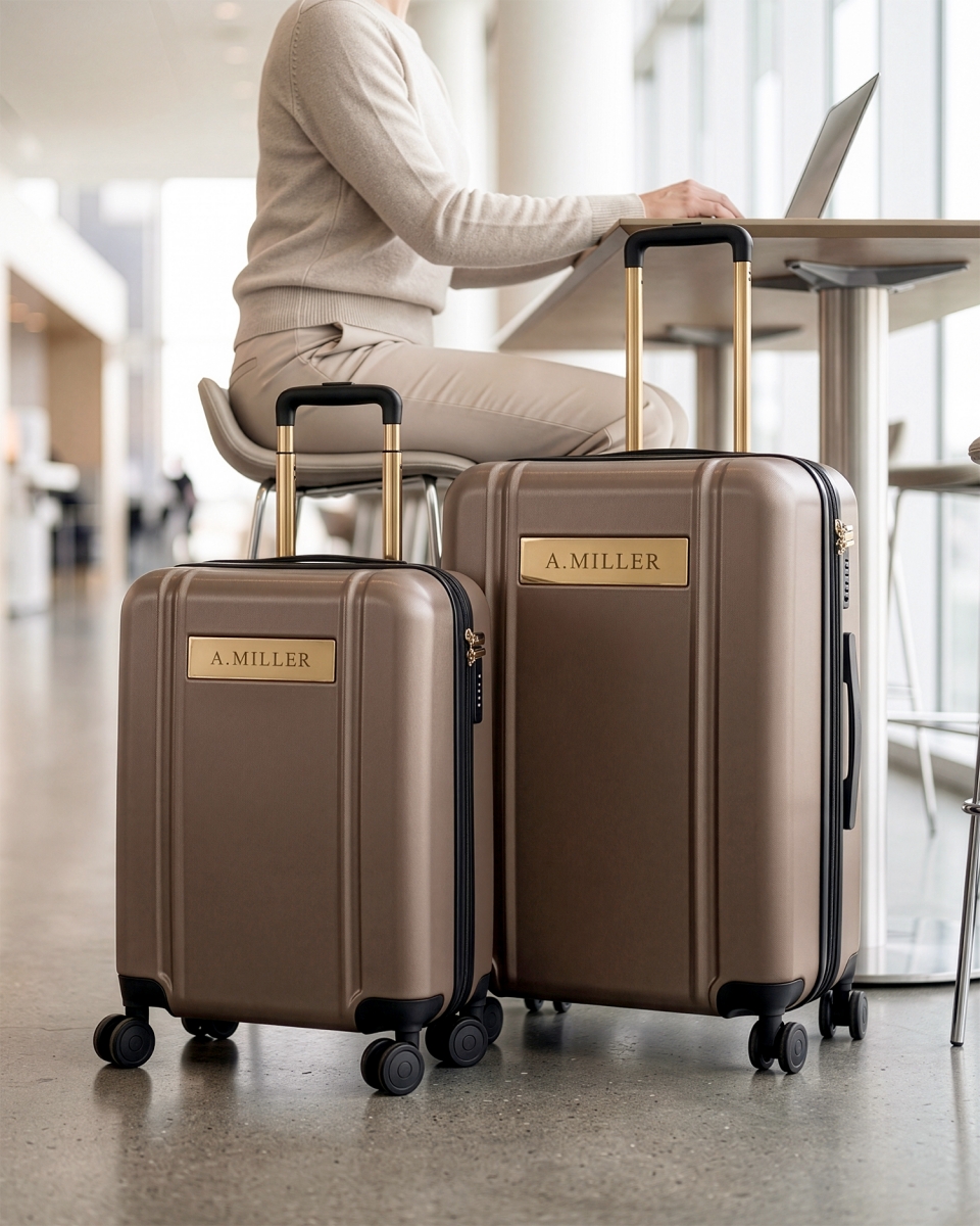 Navnet graveres inn i en metallbrikke på koffertens fremside.