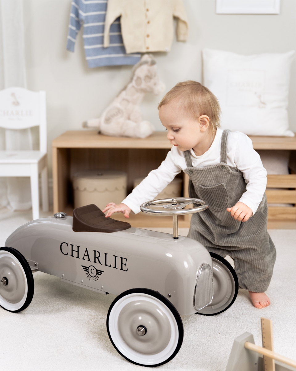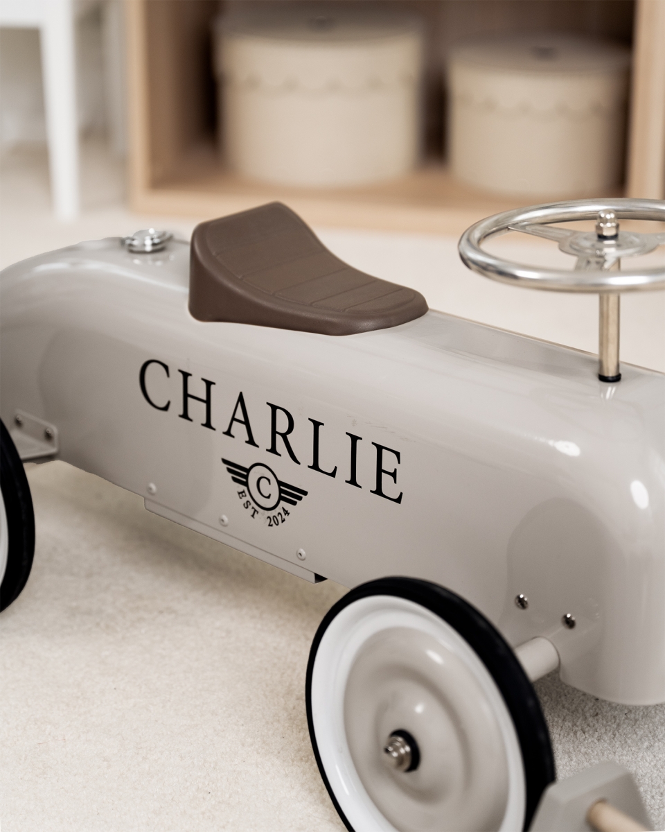 Den klassiske stilen og minimalistiske designen gjør bilen til et stilig innslag på barnerommet samtidig som den inviterer til fartfylte stunder. En leken og personlig måte å skape barndomsminner som varer lenge.