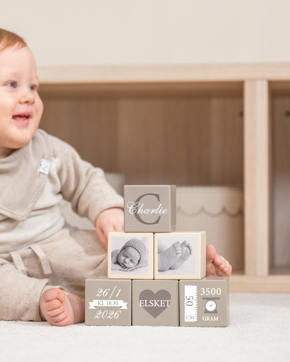 Disse treklossene er både en fin innredningsdetalj og en morsom leke for barnets første år. De er laget i slitesterkt tre og har et tidløst design som gjør dem til en verdsatt gave til dåp eller den første bursdagen. I tillegg blir fotoklossene et fint minne å bevare for resten av livet.